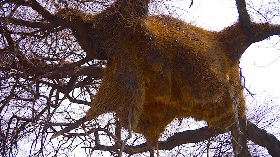 Siebelweber-Nester sind überall in Zentralnamibia und Zentralkalahari zu finden. Siedelweber sind kleine (ca. 14 cm große) lebhafte und lautstarke Koloniebrüter. Die Vögel bauen erst eine Art Dach über einem kräftigen Ast und dann kommen über Jahre immer mehr Einzelapartments dazu. Die Nester erreichen über 4 m in der Breite mit weit über 100 Nestern. Oft stürzen irgendwann Teile des Nestes ab oder der ganze Ast bricht unter der Last.
