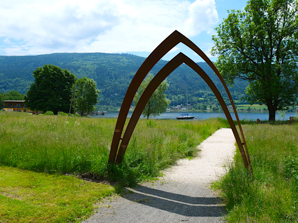 An dem wunderschön gestalteten Ufer des Ossiacher Sees entlang begeistern herrliche Ausblicke auf den Ossiacher See. Hier sind auch die am verführerischsten umgesetzte Slow Trail Symbolik zu finden: Bootsspanten mit Hängematten.
