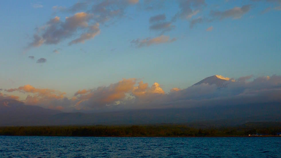 Gemütlich tuckert das Boot dann los, immer entlang der Nordküste von Lombok. Die Nord-Ostküste ist nur wenig besiedelt, ab und zu ein kleines Dorf oder ein paar Häuser. Immer aber zieht der 3.726 m hohe, stolze, als heilig verehrte Mt. Rinjani mit uns mit, sofern er nicht von Wolken verhangen ist.