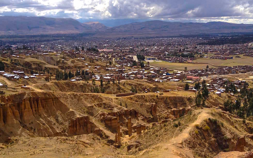 Blick von oben auf dem Hügel hinunter auf den Vorort und im Hintergrund Huancayo und die Anden – so schön!