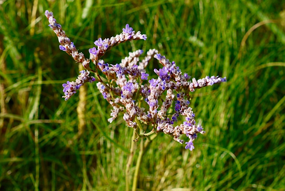 Unterhalb in der unteren Salzwiese sind im Herbst noch die letzten Blüten des Strandflieders zu entdecken. Im Sommer bilden sich weite, violette Teppiche in den Salzwiesen. Seine Blätter besitzen Salzdrüsen um den Salzhaushalt zu regeln.