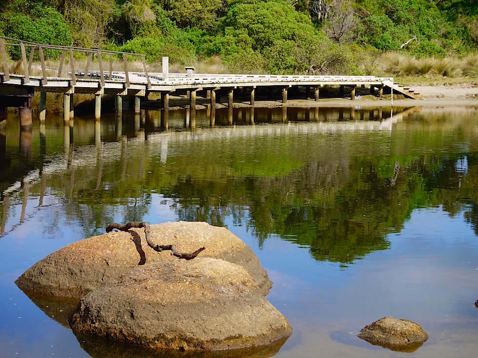 Von Tidal River aus bietet sich der 5 km lange Tidal Overlook Circuit. Der Rundweg führt zuerst über den Tidal River. Die Farbe des Flusswassers ist rot-bräunlich. Die Färbung entsteht durch das Tannin der am Ufer wachsenden australischen Teebäume und weiteren Myrtengewächsen wie der Südsee-Myrte, die das Wasser tatsächlich wie ein etwas verschmutztes Teewasser aussehen lassen.